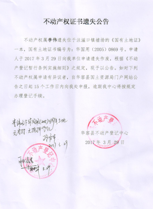 不动产权证书遗失公告【国有土地证(李伟)】