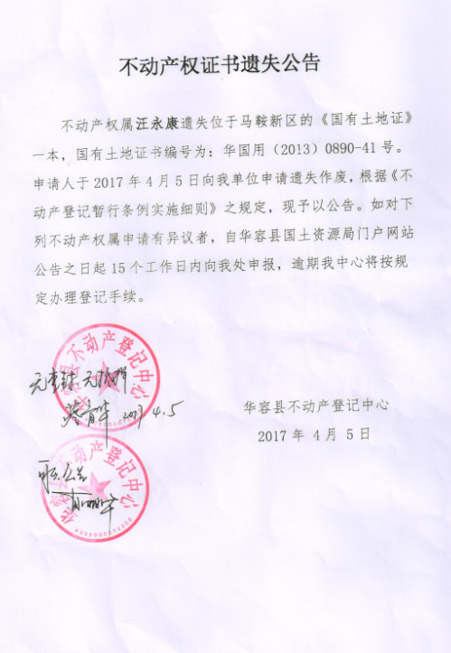 不动产权证书遗失公告【国有土地证(汪永康)】