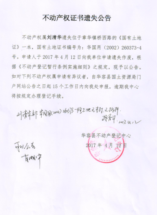 不动产权证书遗失公告【国有土地证(刘清华)】