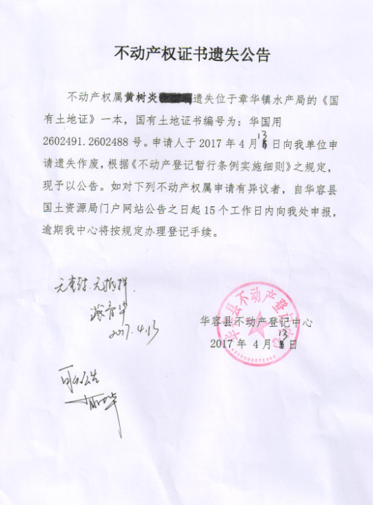 不动产权证书遗失公告【国有土地证(黄树炎)】