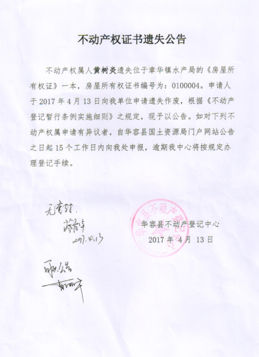 不动产权证书遗失公告【房屋所有权证(黄树炎)】