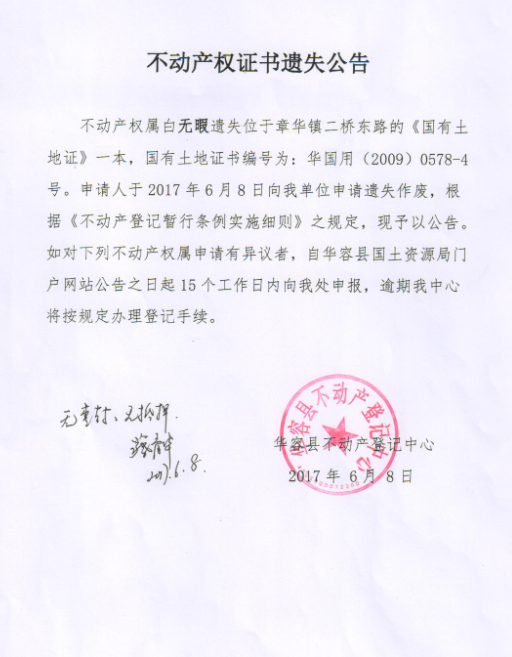 不动产权证书遗失公告【国有土地证(白无瑕)】