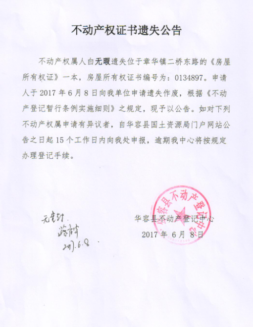 不动产权证书遗失公告【房屋所有权证(白无瑕)】