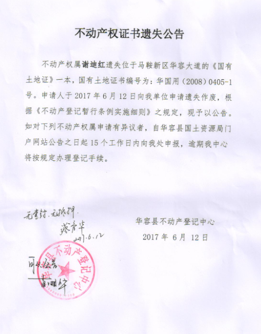 不动产权证书遗失公告【国有土地证(谢迪红)】