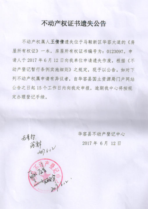 不动产权证书遗失公告【房屋所有权证(王倩倩)】
