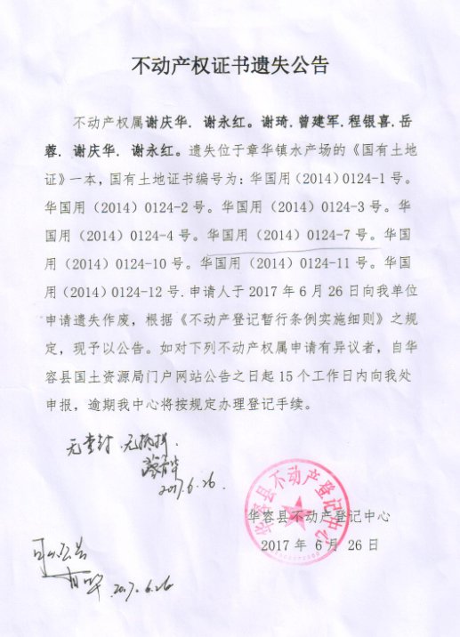 不动产权证书遗失公告【国有土地证(谢庆华、谢永红、谢琦、曾建军、程银喜、岳蓉、谢庆华、谢永红)