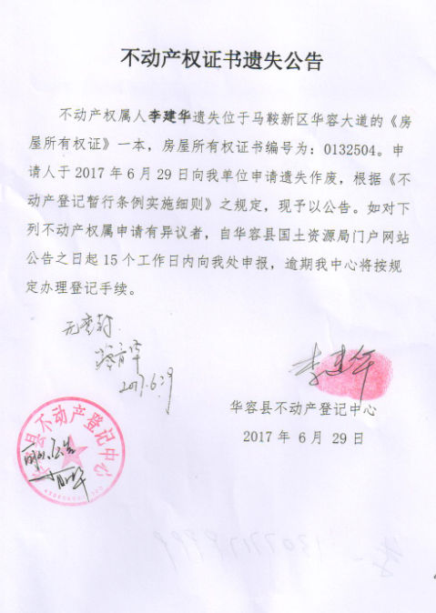 不动产权证书遗失公告【房屋所有权证(李建华)】