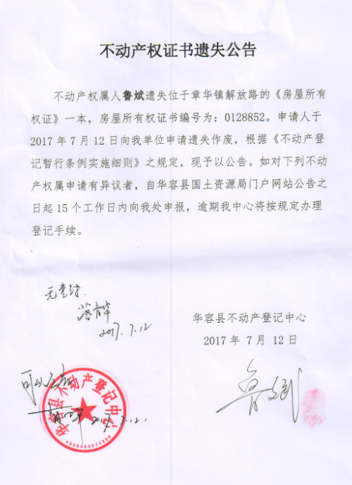 不动产权证书遗失公告【房屋所有权证(鲁斌)】