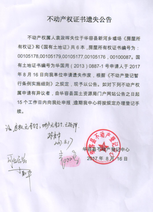 不动产权证书遗失公告【房屋所有权证、国有土地证(袁政晖)】