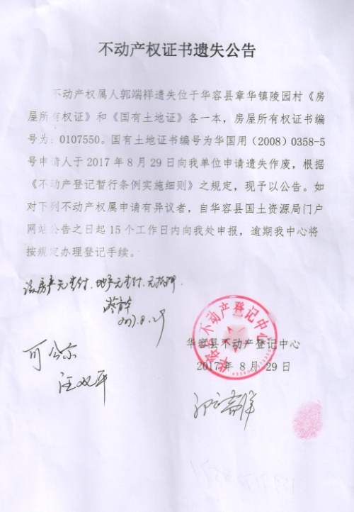 不动产权证书遗失公告【房屋所有权证 国有土地证(郭端祥)】