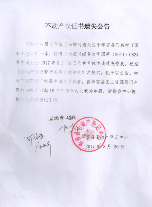 不动产权证书遗失公告【国有土地证(华容县马鞍村)】