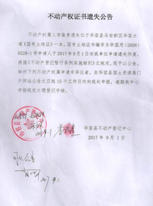 不动产权证书遗失公告【国有土地证(李隆贵)】