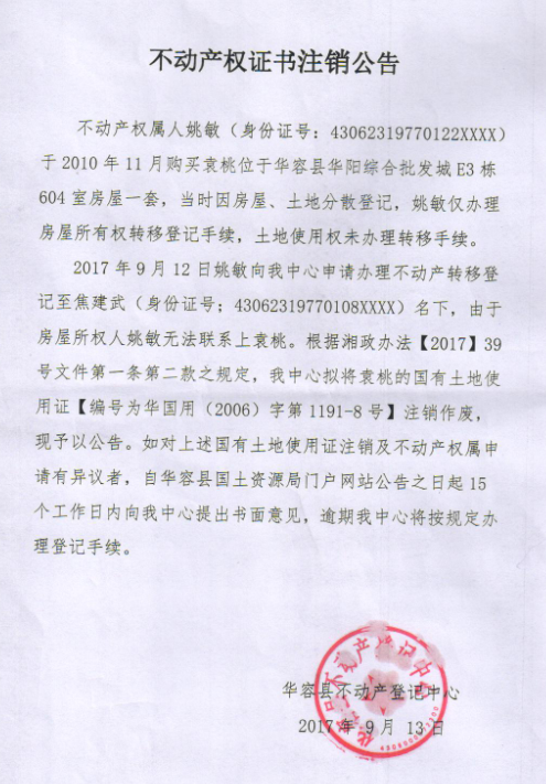 不动产权证书注销公告【国有土地证(袁桃)姚敏】