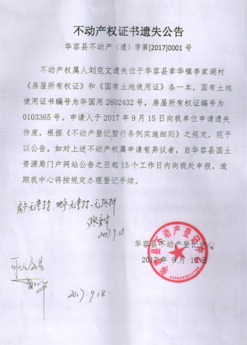 不动产权证书遗失公告(刘克文)华容县不动产(遗)字第【2017】0001号