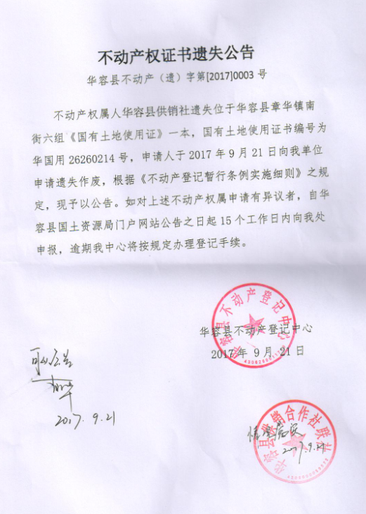 不动产权证书遗失公告(华容县供销社)华容县不动产(遗)字第【2017】0003号
