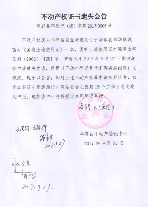 不动产权证书遗失公告【国有土地证(华容县农业局)】