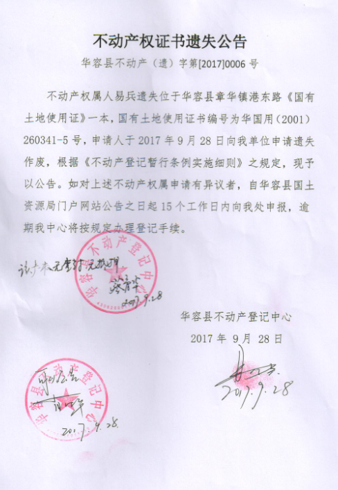 不动产权证书遗失公告【国有土地证(易兵)】
