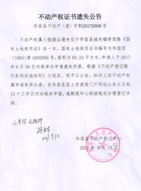 不动产权证书遗失公告【国有土地证(张丽云)】