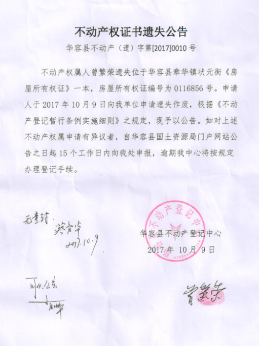 不动产权证书遗失公告【房屋所有权证(曾繁荣)】