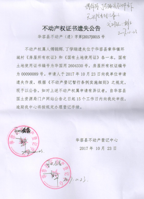 不动产权证书遗失公告【房屋所有权证 国有土地征(傅锦辉 丁学瑞)】