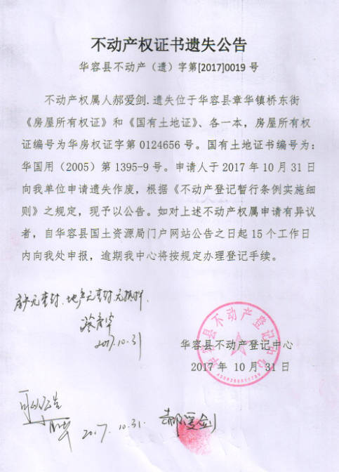 不动产权证书遗失公告【房屋所有权证 国有土地证(郝爱剑)】
