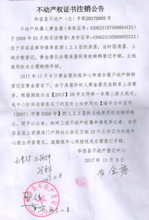 不动产权证书注销公告【国有土地证(汤菊香转黄金蓉)】