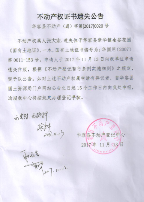 不动产权证书遗失公告【国有土地证(张大宏)】