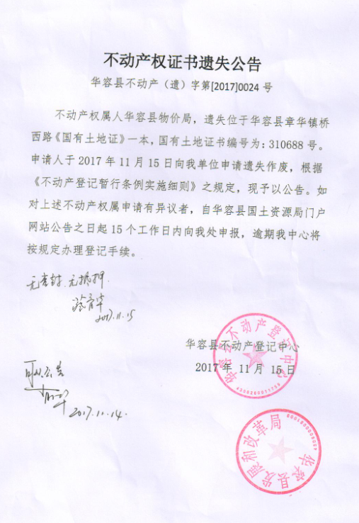 不动产权证书遗失公告【国有土地证(华容县物价局)】