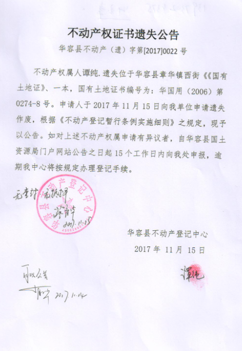 不动产权证书遗失公告【国有土地证(谭纯)】