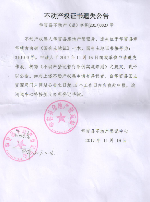 不动产权证书遗失公告【国有土地证(华容县房地产管理局)】