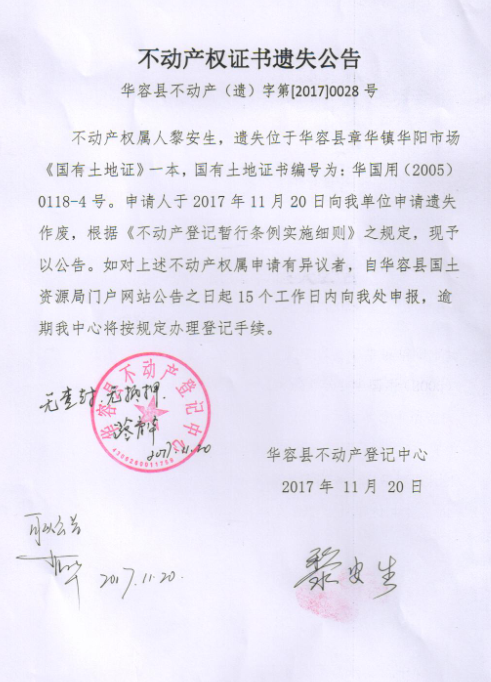 不动产权证书遗失公告【国有土地证(黎安生)】