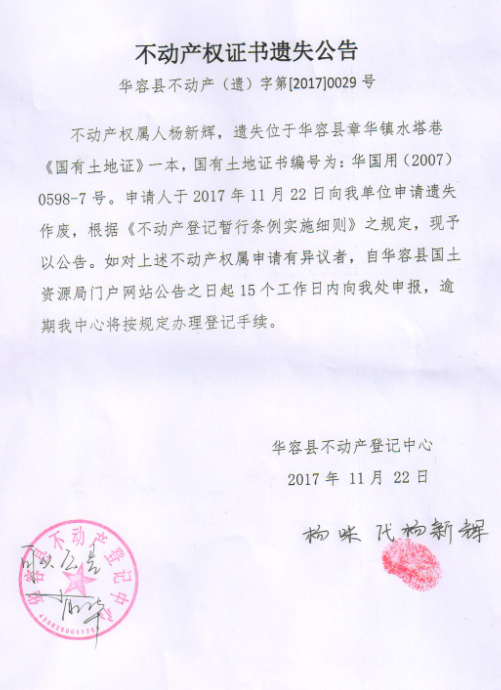 不动产权证书遗失公告【国有土地证(杨新辉)】