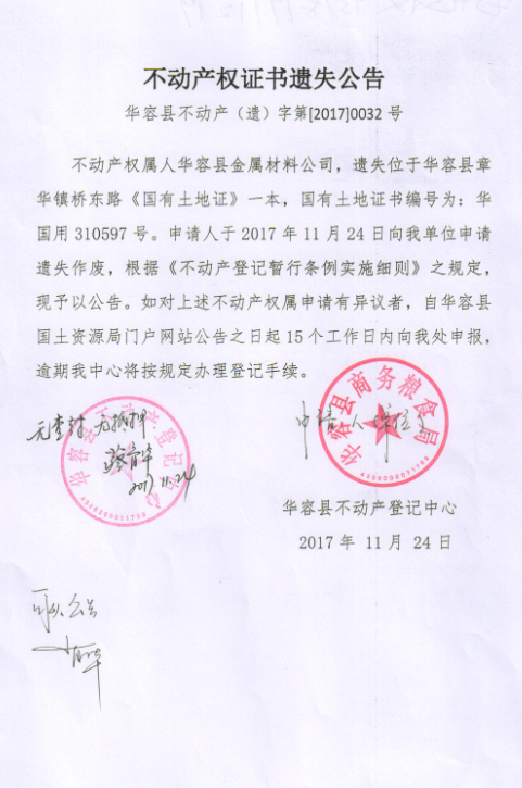 不动产权证书遗失公告【国有土地证(华容县金属材料公司)】