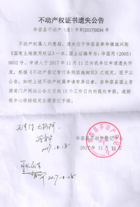 不动产权证书遗失公告【国有土地证(刘惠超)】