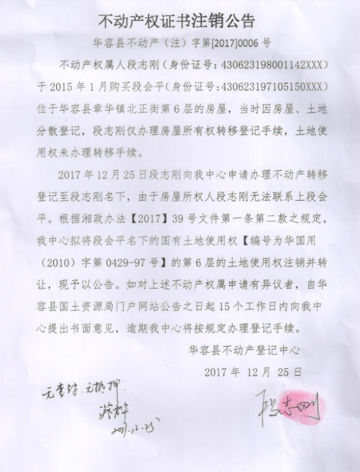 不动产权证书注销公告【国有土地证(段会平转段志刚)】