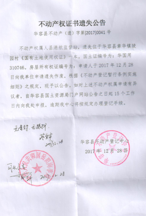 不动产权证书遗失公告【国有土地证(县港航监督站)】