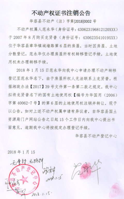不动产权证书注销公告【国有土地证(龙贤普转范永华)】