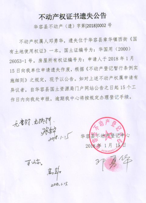 不动产权证书遗失公告【国有土地证(邓勇华)】