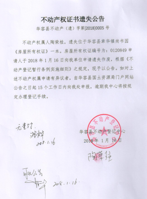 不动产权证书遗失公告【房屋所有权证(陶荣桂)】