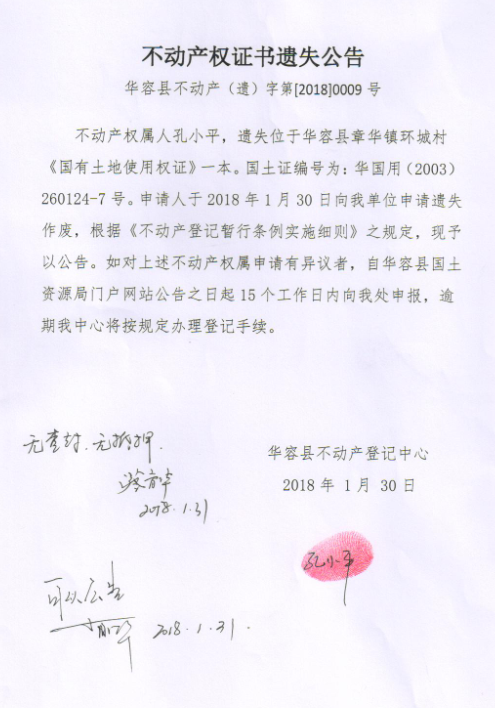 不动产权证书遗失公告【国有土地证(孔小平)】