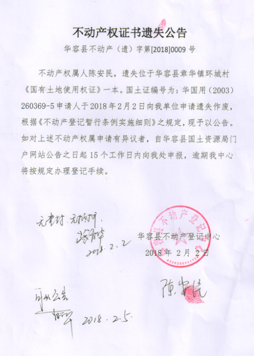 不动产权证书遗失公告【国有土地证(陈安民)】