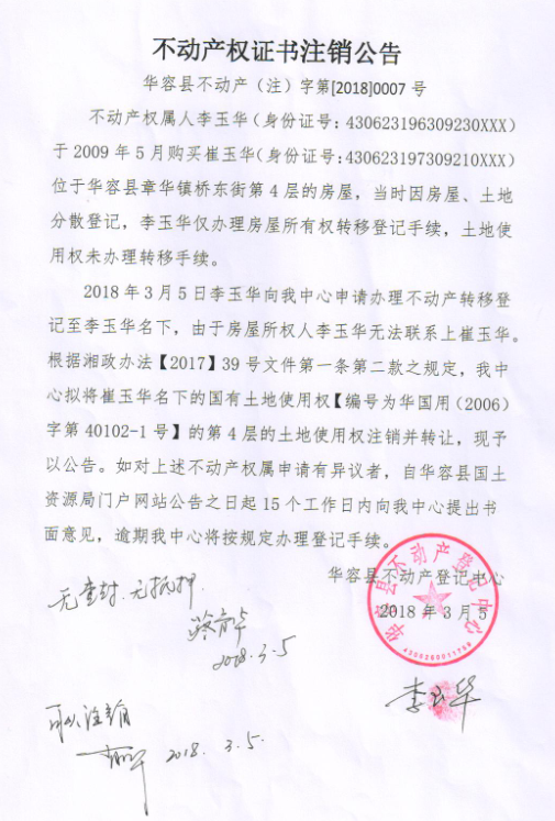 不动产权证书注销公告【国有土地证(崔玉华转李玉华)】