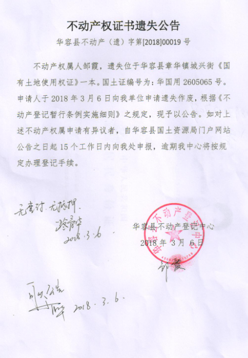 不动产权证书遗失公告【国有土地证(邹霞)】