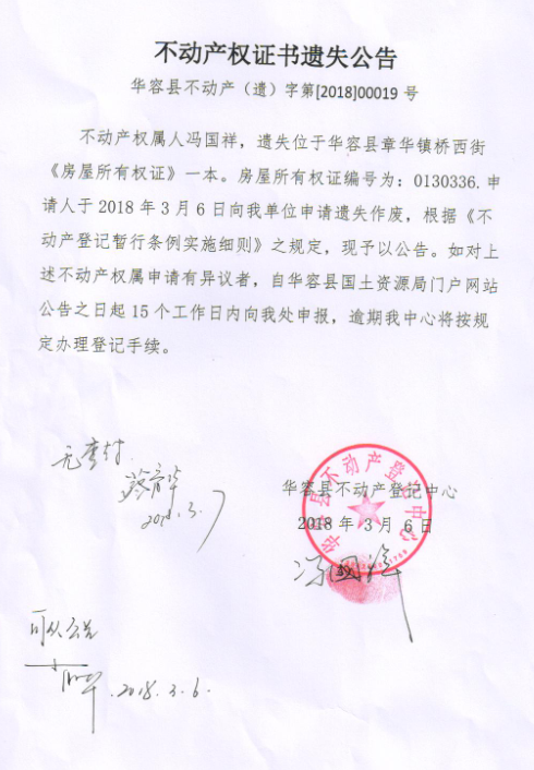 不动产权证书遗失公告【房屋所有权证(冯国祥)】
