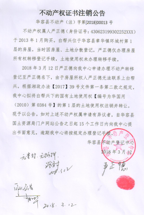 不动产权证书注销公告【国有土地证(白帮兴转严正德)】