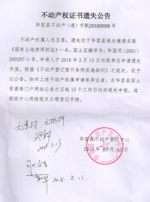 不动产权证书遗失公告【国有土地证(毛玉香)】