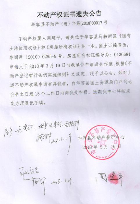 不动产权证书遗失公告【国有土地证 房屋所有权证(周建平)】