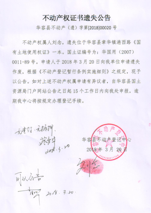 不动产权证书遗失公告【国有土地证(刘念)】