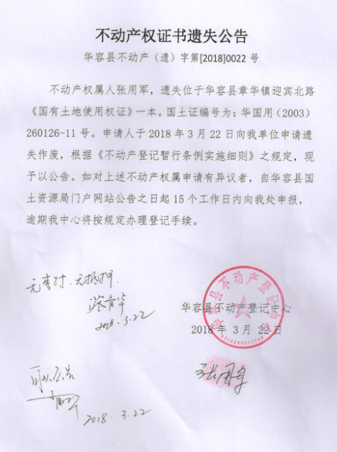 不动产权证书遗失公告【国有土地证(张用军)】