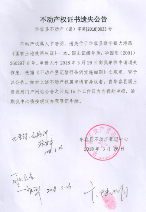 不动产权证书遗失公告【国有土地证(卞陆明)】